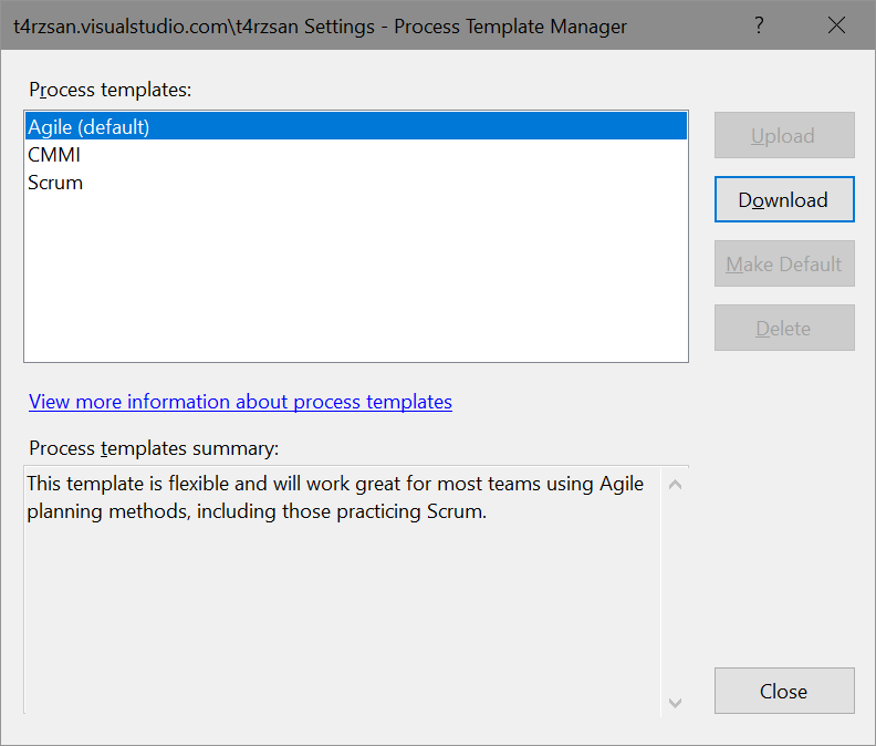 To export the WITs go to the menu Team –> Team Project Collection Settings –> Process Template Manager. Here you need to decide which template you wish to upgrade to. If you want to upgrade to the “Agile” template, then that is the one you should download.